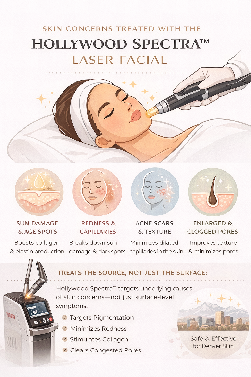 At Denver Dream Medspa, all Hollywood Spectra™ laser treatments are performed by licensed professionals using customized protocols based on skin type, environment, and long-term outcomes. Our approach emphasizes education, safety, and sustainable results—earning trust from patients across Denver.